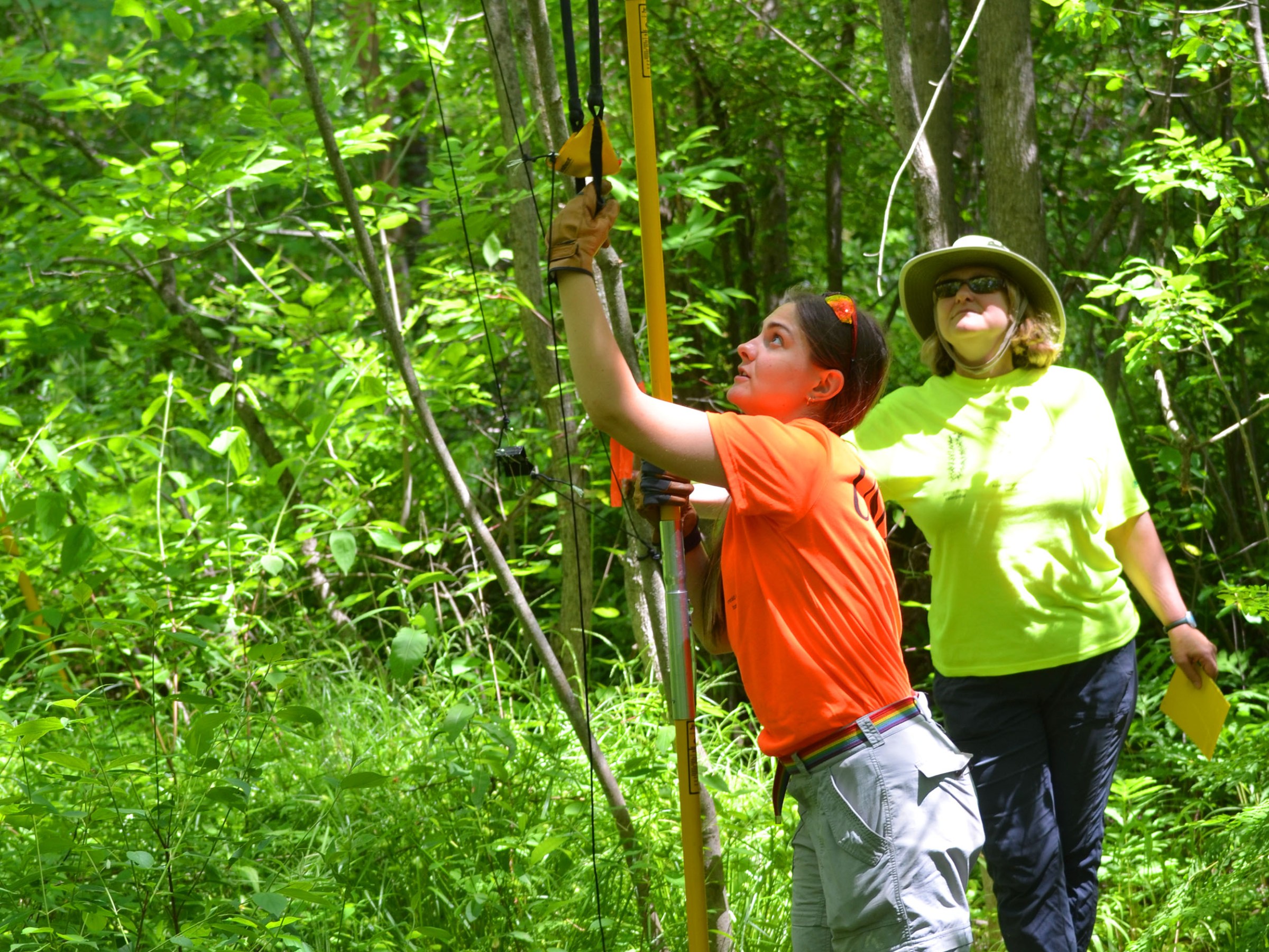 Today, they were shooting lines into the trees with a big sling shot to which they will rig the cards. Technicians from the University of New Hampshire will come weekly during the summer to set out clean sticky cards and take the old ones back to their lab for inspection. The New Hampshire Technical Institute (NHTI) will host a similar experiment. Theresa said Riverland and NHTI were chosen because they each had a moderate EAB infection, small, middle and large ash trees in close proximity to each other, and a landowner willing to give permission.